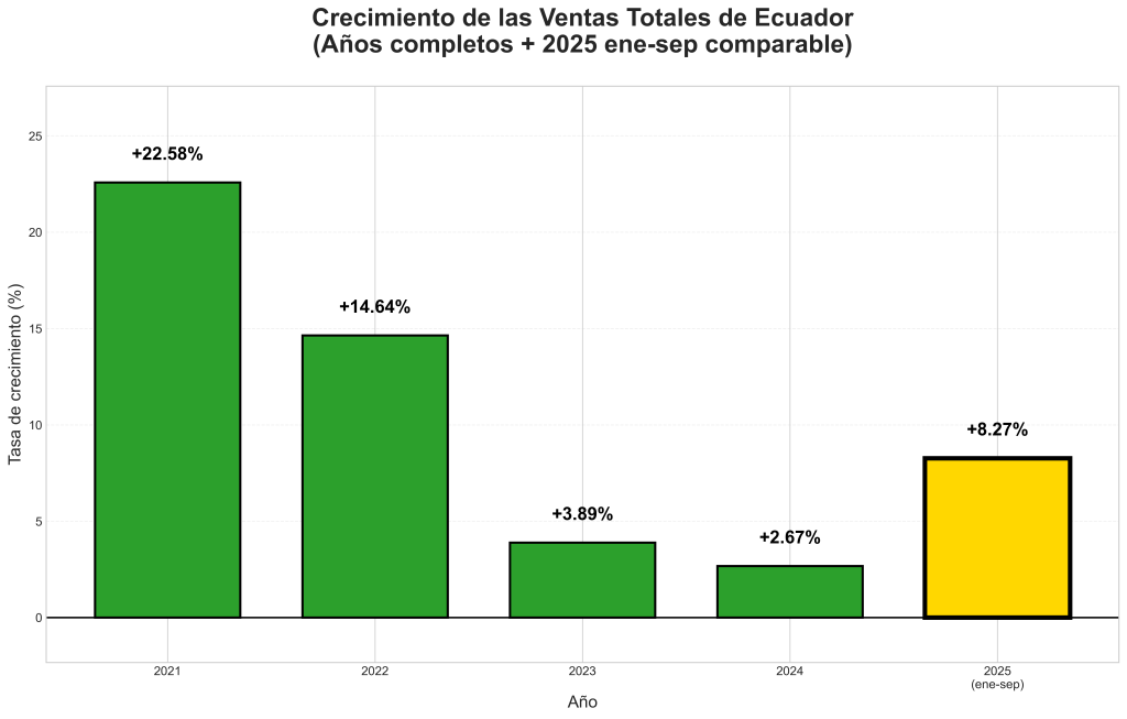 Los datos acumulados de enero a septiembre de 2025 muestran que Ecuador está experimentando una recuperación comercial más fuerte de lo previsto. Según tus cálculos —y la serie mensual reconstruida con apoyo de inteligencia artificial— el crecimiento de las ventas totales alcanza un 8.27%, muy por encima del 2.67% registrado en todo 2024. Esta aceleración evidencia que la actividad económica, medida desde la facturación empresarial, está entrando en una fase de reactivación más amplia después de varios años de debilidad. Aun así, será fundamental observar si este dinamismo se mantiene hacia el cierre del año, considerando efectos estacionales, ajustes contables y posibles variaciones en la demanda agregada.