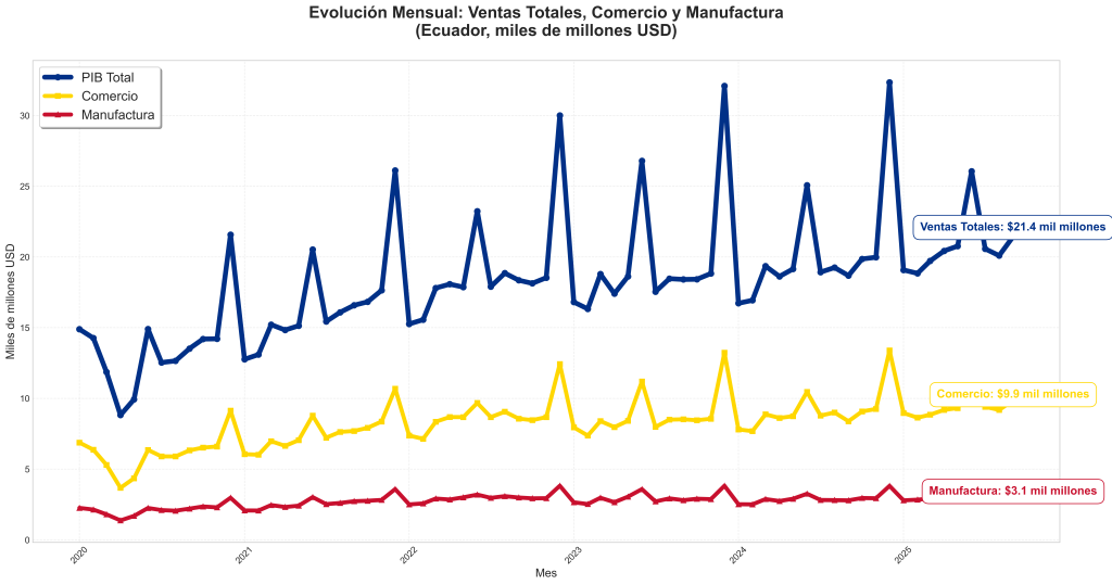 La evolución mensual de las ventas también refuerza esta lectura. El gráfico muestra cómo, a lo largo de los últimos años, la facturación nacional ha seguido una tendencia ascendente, con picos estacionales claros y un fortalecimiento visible en 2024 y 2025. El valor más reciente sitúa las ventas mensuales en niveles históricamente altos, con comercio bordeando los USD 9.9 mil millones y manufactura aproximándose a USD 3.1 mil millones, lo que confirma que la recuperación no se limita a sectores específicos, sino que atraviesa de manera transversal a gran parte del tejido productivo. Sin embargo, el ritmo de crecimiento en manufactura sigue siendo moderado, lo que sugiere que el motor de la recuperación está más alineado con consumo que con expansión industrial.