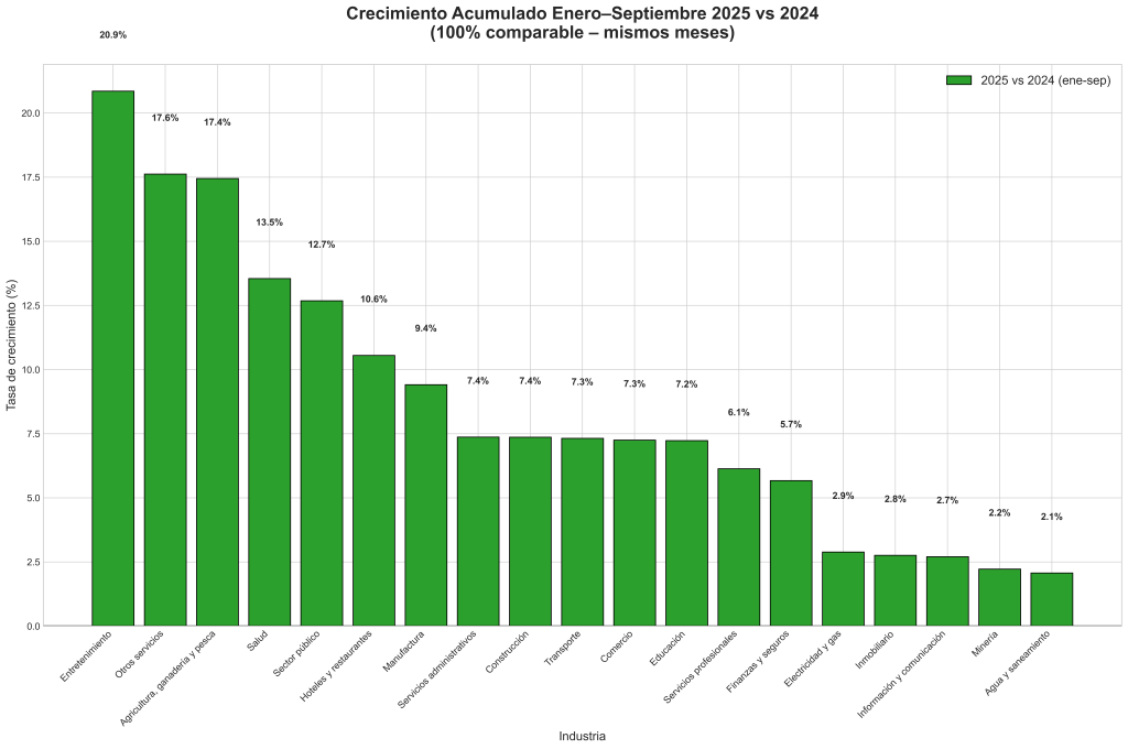 Cuando se observa la serie histórica del crecimiento anual de las ventas, también aparece un contexto relevante. Tras los fuertes repuntes post-pandemia —22.58% en 2021 y 14.64% en 2022— la economía entró en una fase de desaceleración significativa: 3.89% en 2023 y 2.67% en 2024. En este marco, el 8.27% acumulado a septiembre de 2025 representa un quiebre importante de tendencia. Sin embargo, es imprescindible interpretarlo con cautela. Parte de este repunte puede estar influido por efectos base favorables o por normalizaciones en sectores que registraron caídas inusuales en 2024. El desafío analítico está en identificar cuánto del crecimiento actual es estructural y cuánto es transitorio.